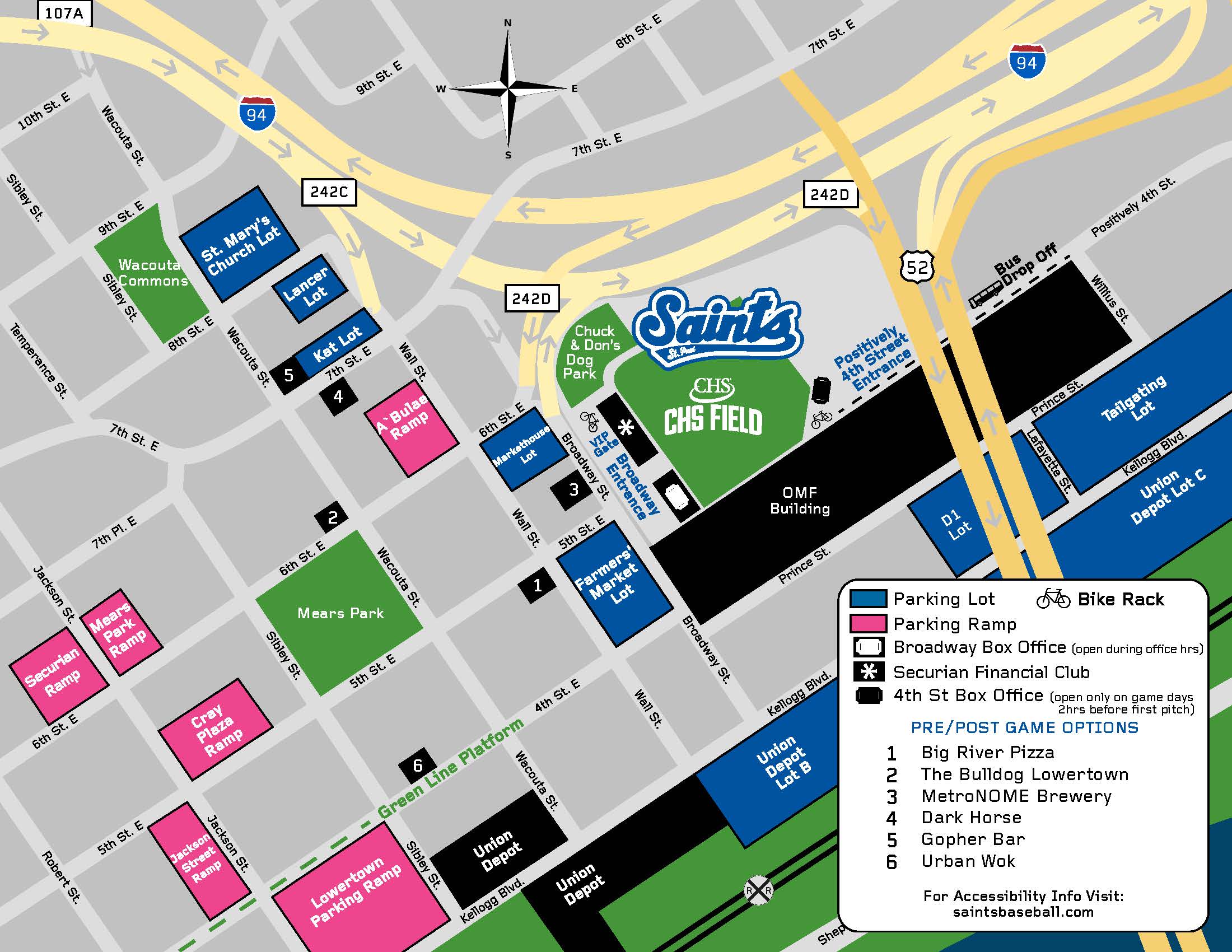 CHS Field Address is conveniently located off of I-94 and HWY 52 at 360 N Broadway, St. Paul, MN 55101.